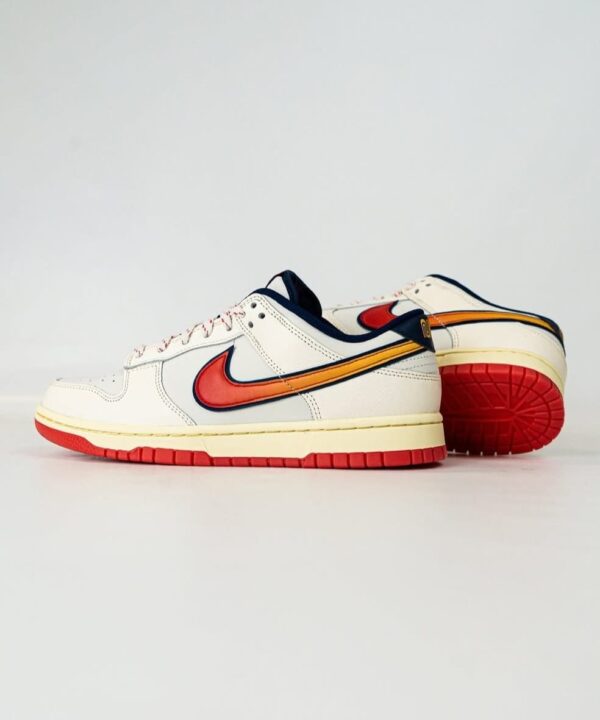 Stand out with every step in the NK Dunk Low “Red Sunset Swoosh”, a stunning pair of sneakers that brings heat to your everyday outfit. Featuring a unique triple-tone Swoosh in red, orange, and yellow—outlined in navy blue—this pair fuses vintage vibes with modern flair. Perfect for streetwear lovers and sneaker collectors alike!
